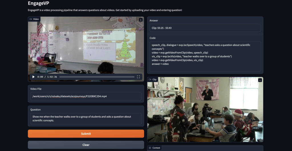 EngageVP has been tested on several classroom videos capturing collaborative learning with the EcoJourneys narrative-centered learning environment that were annotated by learning scientists from Indiana University. The framework has been tested with a set of question-answer pairs addressing multiple different aspects of student behavior such as speech/conversations (finding where a specific conversation happened or detecting specifics about disagreements/agreements among the students), general student engagement/socioemotional states of the students (retrieving when students are confused/frustrated or gauging overall student contribution in a discussion), and visual events (finding where people are located or when a specific action occurred).